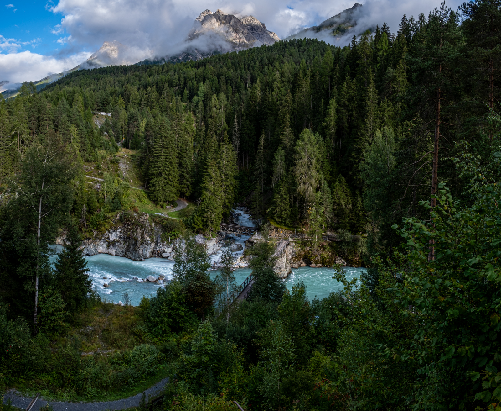 Am zweiten Tag strömte es vom Himmel und wir erledigten ein paar Dinge mit Bus und Bahn. Am Abend klarte es auf und wir unternahmen einen Spaziergang durch und um Scuol.