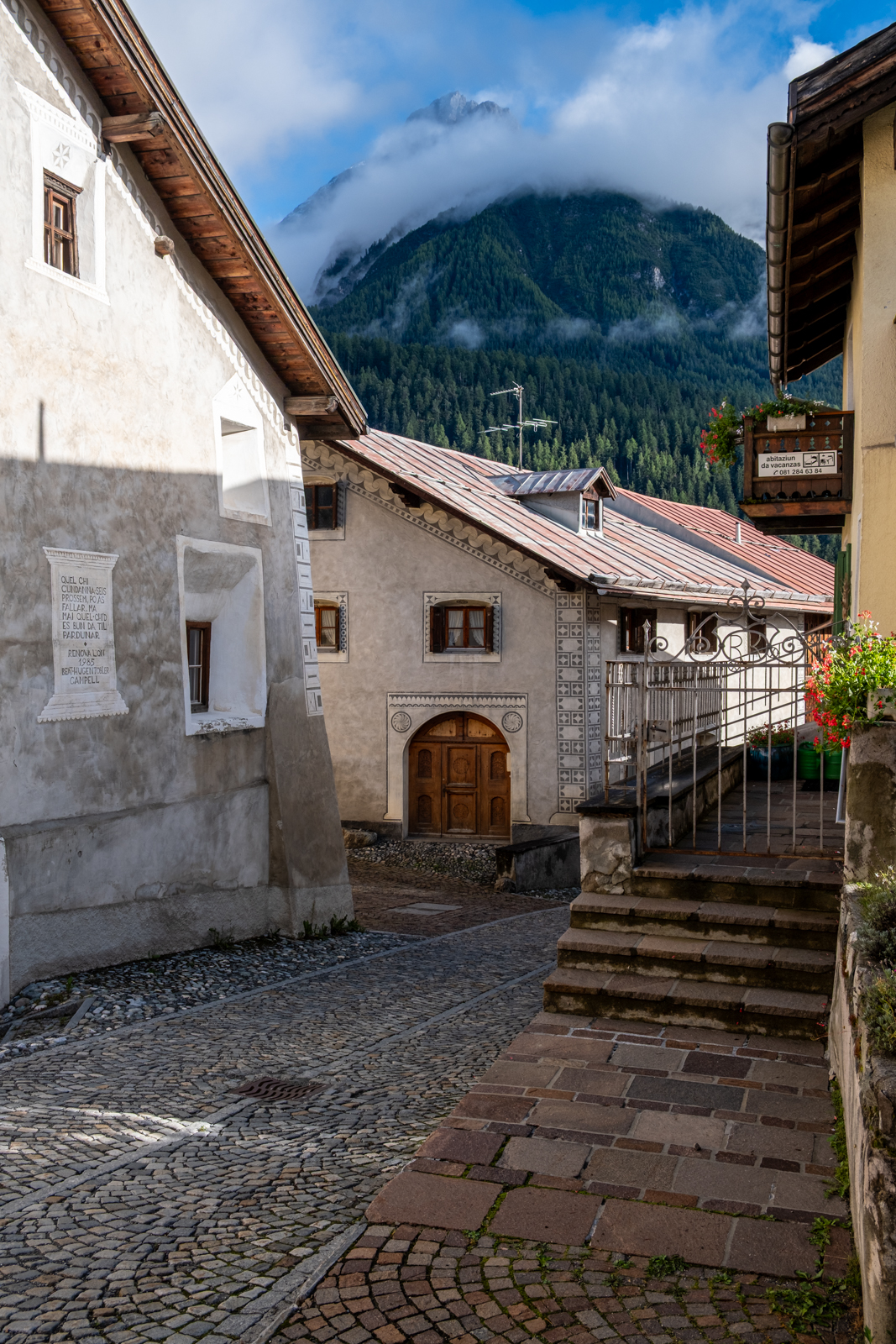 Der letzte Tag war wieder regnerisch. Wir besuchten Guarda, ein “Musterdorf romanischer Kultur und lebendiger Tradition”. Von dort schritten wir weiter bis nach Ardez, im Blick immer das Tal des Inns gesäumt von wolkenverhangenen Bergen.