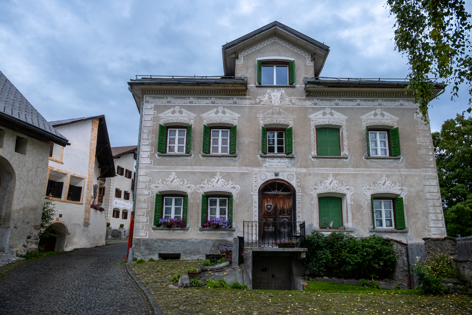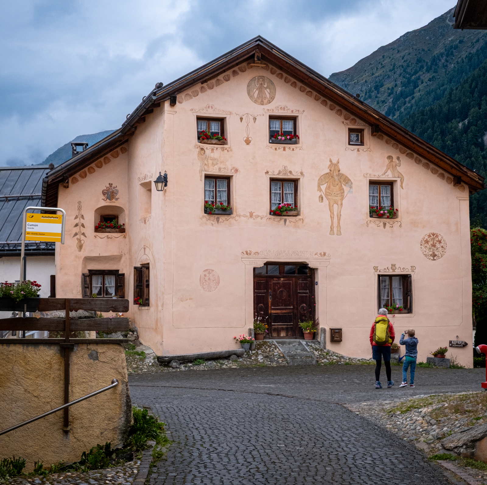 Der letzte Tag war wieder regnerisch. Wir besuchten Guarda, ein “Musterdorf romanischer Kultur und lebendiger Tradition”. Von dort schritten wir weiter bis nach Ardez, im Blick immer das Tal des Inns gesäumt von wolkenverhangenen Bergen.